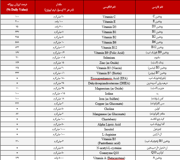 ویتامینهای A، B1، B2، B3، B5، B6، B12، C، D3، E، فولیک اسید، سلنیوم، زینک، بیوتین، ایکوزاپنتانوئیک اسید (EPA)، دیهیدرواپی آندروسترون (DHEA)، منیزیم، ید، آهن، مس، کولین، منگنز، آلفا لیپوئیک اسید، اینوزیتول، کوآنزیم Q10، ال-آرژنین، ان-استیل-ال-سیستئین، گیاه پنج انگشت (Chasteberry)